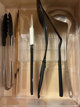 キッチンツールは形がさまざまなので、ひとつの箱にまとめてしまうと取り出すときにストレスを感じやすい収納のひとつだと思います。