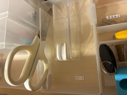 はさみや体温計、50cm定規などの細長い物の収納はもうひとつ工夫をしています。