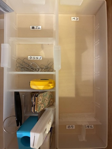 例えば文房具の収納は、家族みんなが使う場所なので、輪ゴムなどの収納場所にはラベリングをして、どこに何を戻すのかが誰でも分かるようにしています。