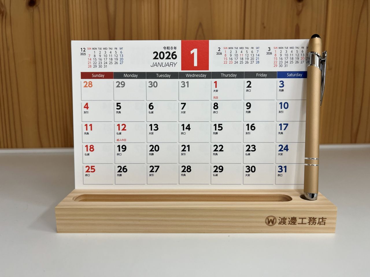 昨年より、従来の壁掛けタイプから「桧のスタンド付きカレンダー」へリニューアルし、