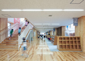 9年間を通じた継続的な教育体制が特徴です。渡邊工務店の施工による木をふんだんに使ったゆとりある校舎は、2010年度中部建築賞・2012年度愛知まちなみ建築賞・2012年度公共建築協会建築賞を受賞。中央に設けられた図書館「メディアセンター」、広大なグラウンド、温水プールなど、子どもたちが快適に学べる環境が整っています。