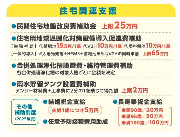 地盤改良費補助や、太陽光発電・蓄電池導入への大型補助金制度 など、住まいの安心をサポートする住宅関連支援 も充実しています。