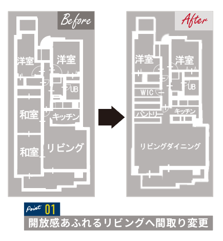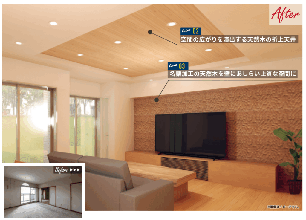 和室をなくし、開放感あふれるリビングへの間取り変更、名栗加工の質感や、折上天井による視覚的な広がりなど、リノベーションならではの醍醐味をぜひ現地でご体感ください。