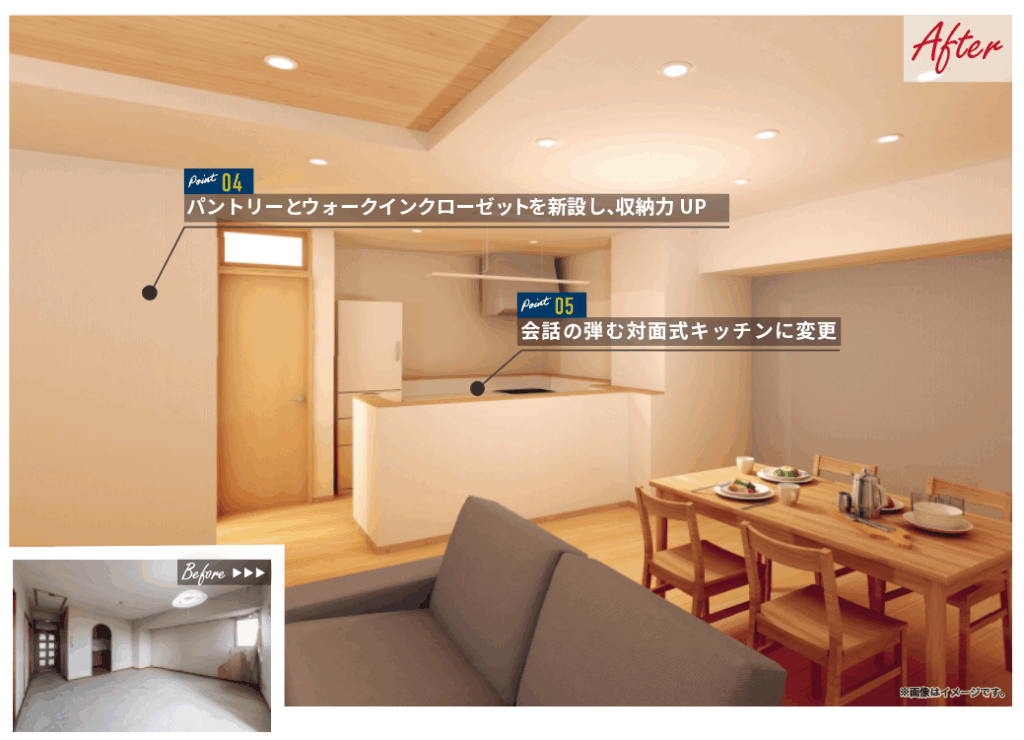 さらにパントリーとWIC(ウォークインクローゼット)を新設し、現代の暮らしに最適な収納力も兼ね備えた、こだわりのリノベーション物件が完成しました。