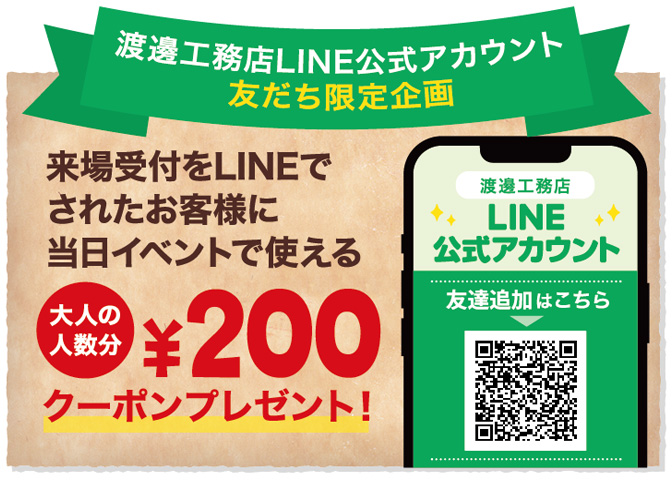 🎁渡邊工務店公式LINEにお友だち登録後、来場受付を入力していただくと、 当日イベントで使える¥200クーポンを大人の人数分プレゼント!🎁