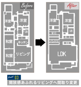 天然木の心地よさと、間取り変更による開放感あふれるリビング。