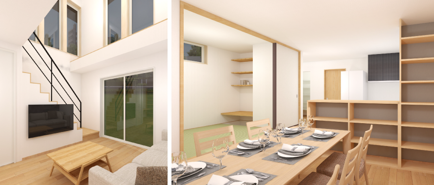 吹き抜けが織りなす開放的なLDKは、家族のぬくもりを感じる心地よい空間。リビングと一体感のある小上がりのタタミコーナーは、くつろぎの時間を豊かに彩ります。キッチン横にはワークスペースを配置し、家事をしながら仕事や趣味にも使える便利な設計。