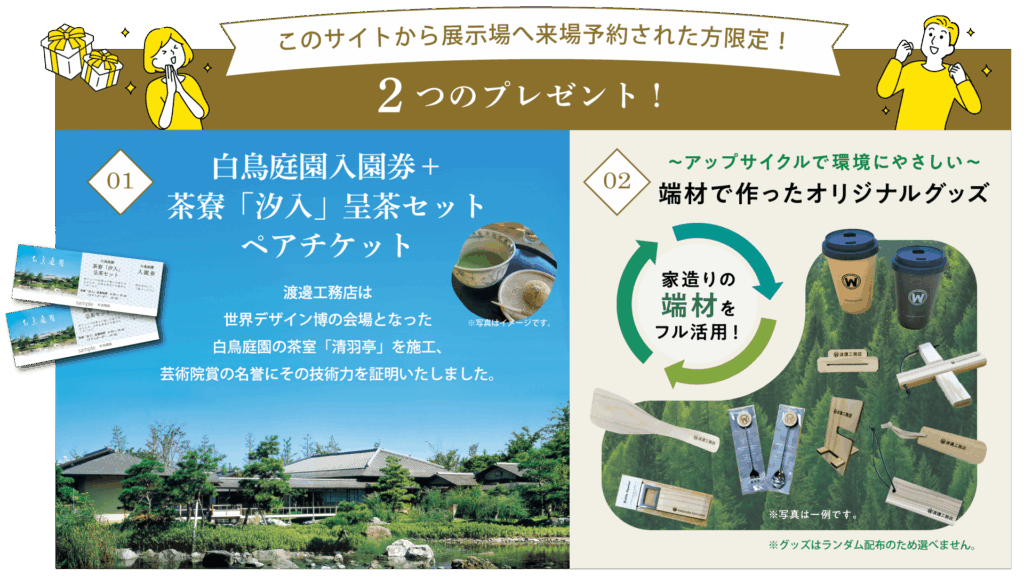 白鳥庭園入園券+呈茶セットペアチケットと家造りで出た端材を有効活用した当社オリジナルノベルティをプレゼントいたします。